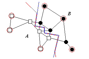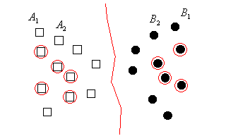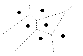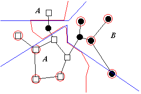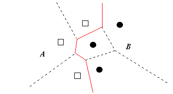 The decision boundary of a decision rule separates all those points of space in which an unknown object will be classified into some particular class from the remaining points where we classify into some other class. Obviously enough, the decision boundary of the nearest neighbour rule belongs to the Voronoi diagram. In other words, the boundaries of the Voronoi regions separating those regions whose nodes are of different class contribute to a portion of the decision boundary (see Figure 2.2).