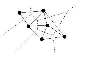 The Delaunay triangulation is a dual of the Voronoi diagram. If two Voronoi regions share a boundary, the nodes of these regions are connected with an edge (see Figure 2.1). Such nodes are called the Voronoi neighbours (or Delaunay neighbours).
